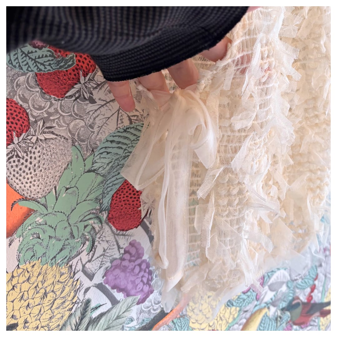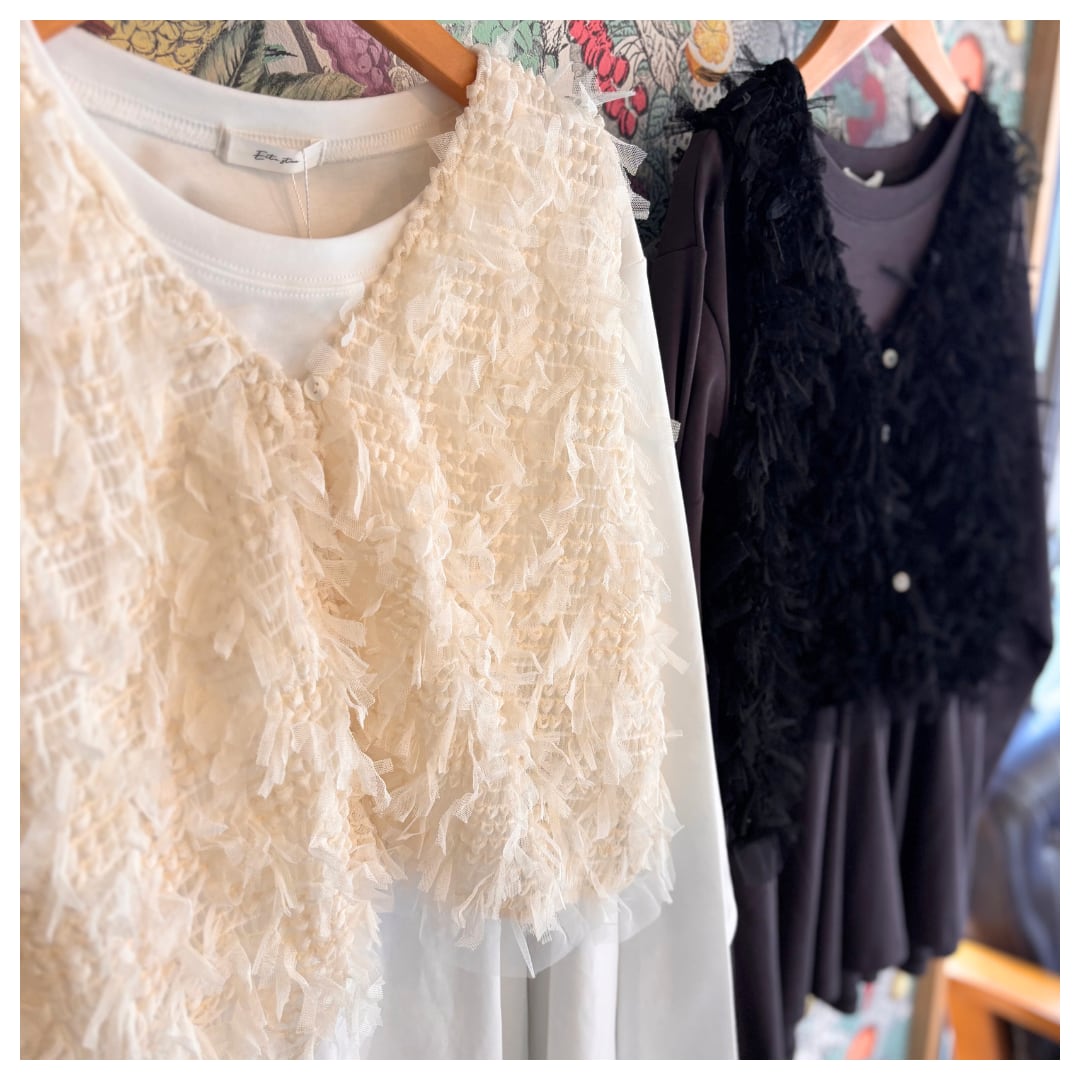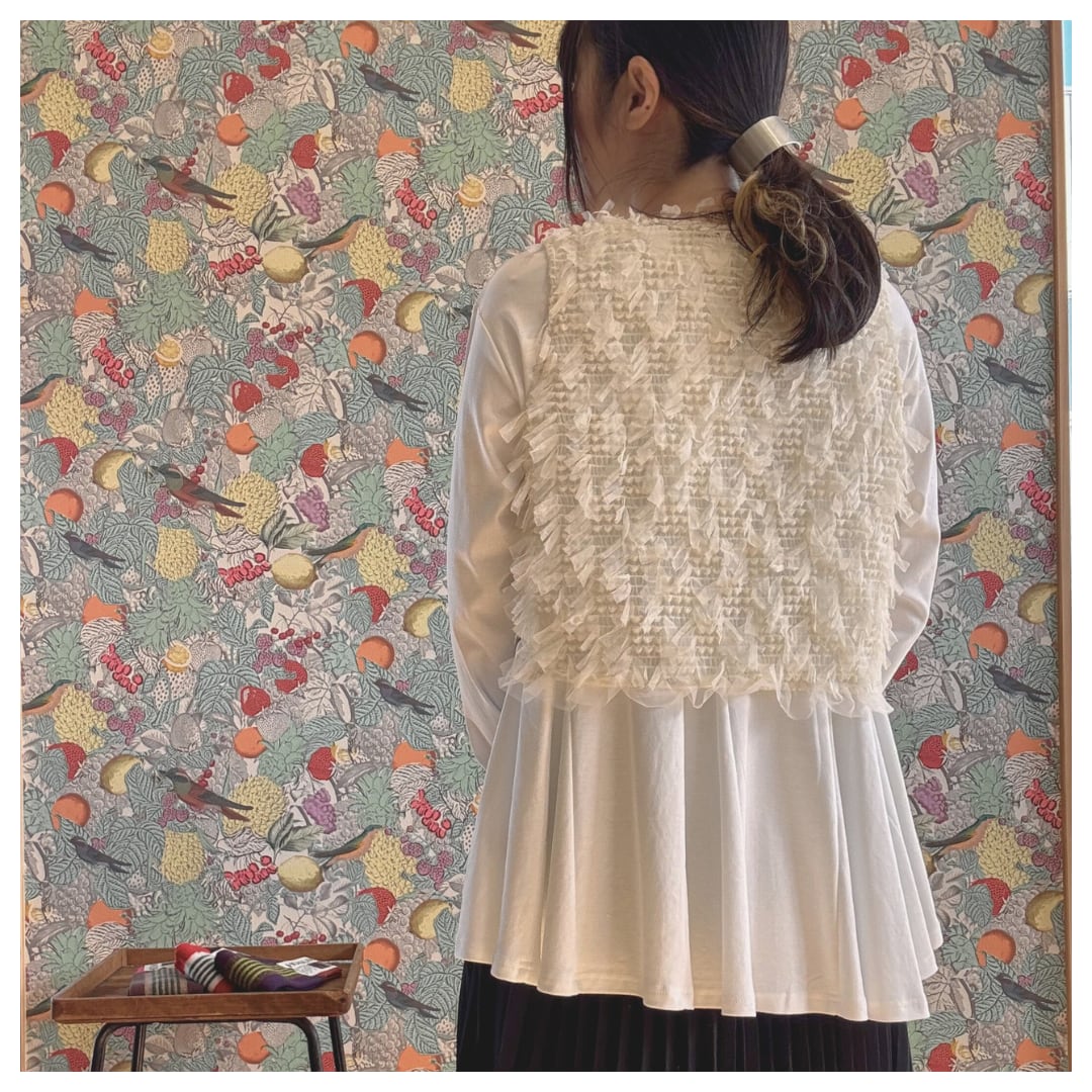 生地感とサイドのリボンが可愛さを演出するショートベストはワンピースなどに合わせても